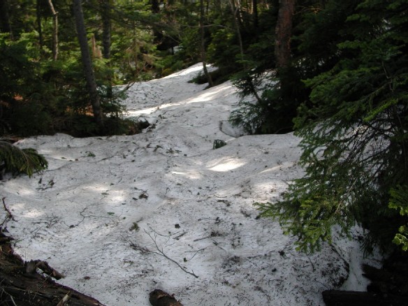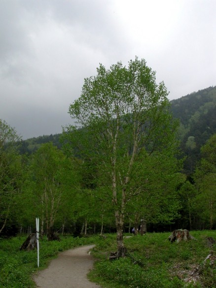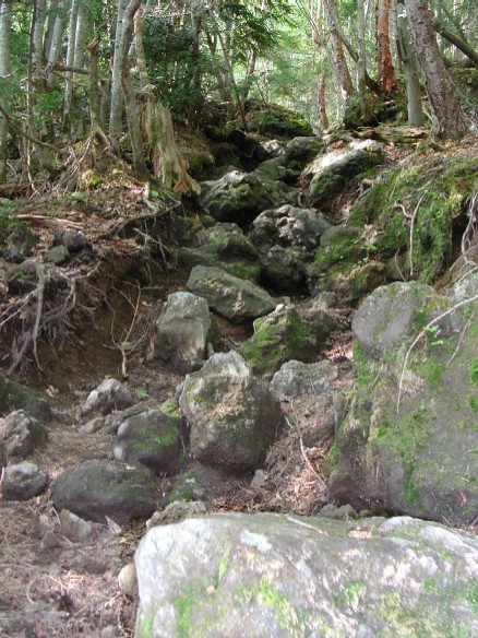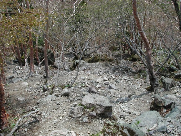 その下は白骨化したダケカンバの林で石も多く苦戦 |