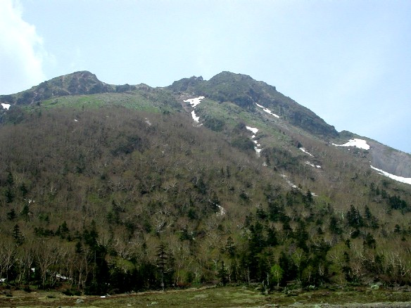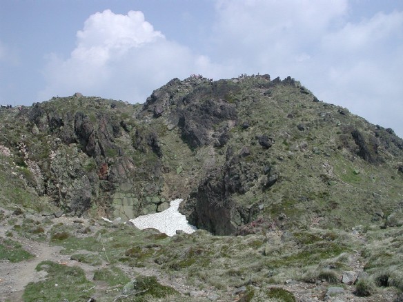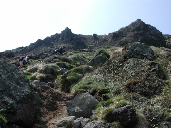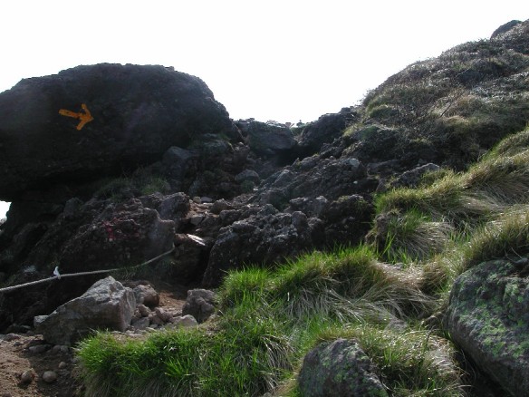 右のような岩場は楽な方で、急な山道を進むが残雪も(↑)多く歩きにくいし、正直、辛かった。 |